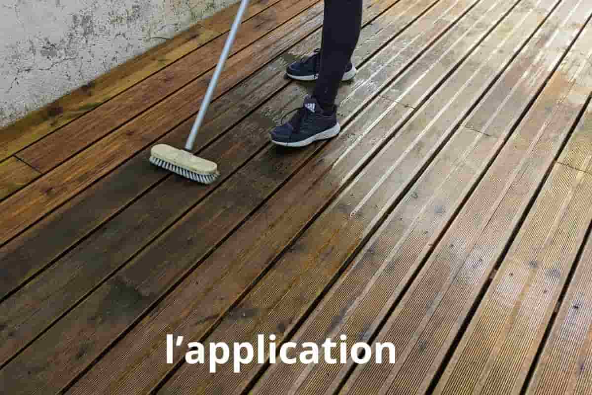 - Commencer sur une petite zone, par exemple 3 lames de terrasse et mouiller au préalable à l’arrosoir pour préparer le bois. Une fois « mouillée » le bois boit mieux le mélange